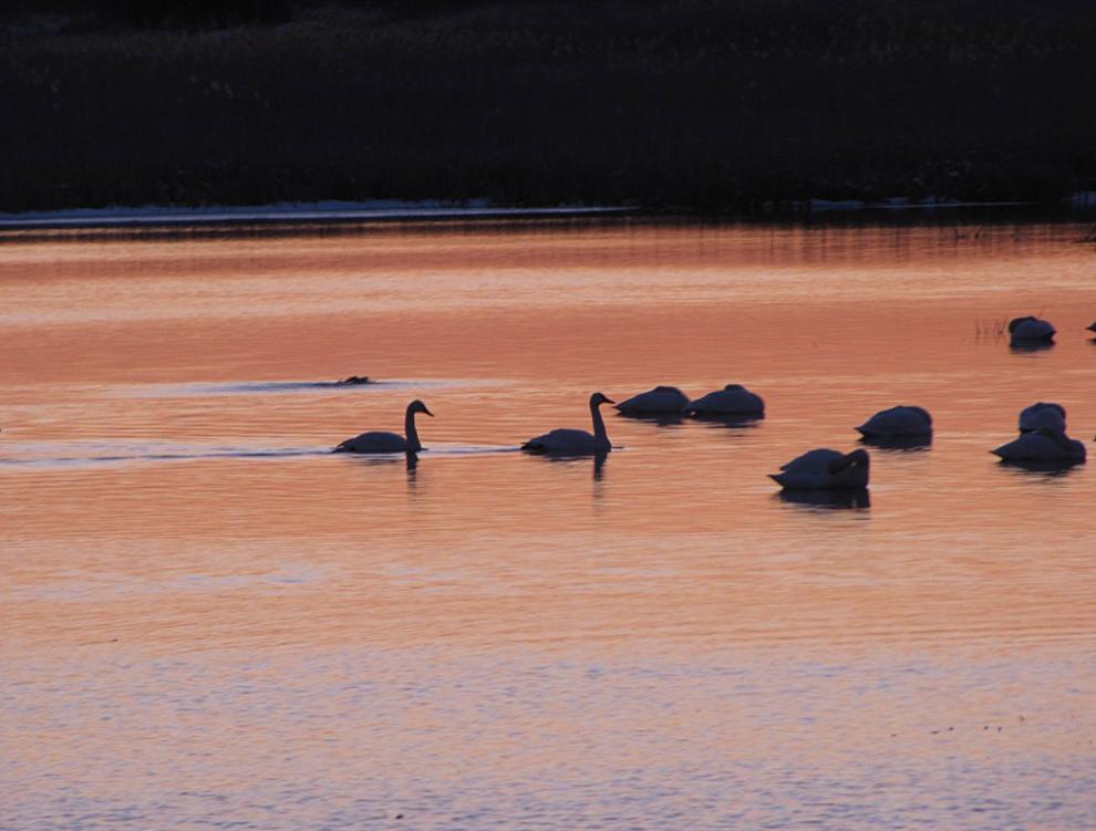 After sunset, some swans are sleeping. It is amazing that they float and sleep comfortably on the icy