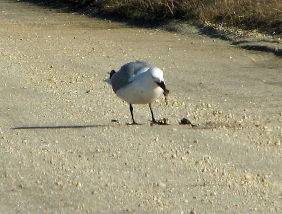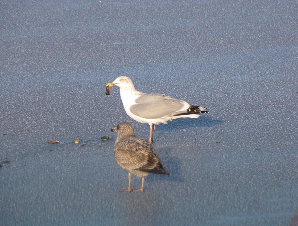 Similarly, this seagull was enjoying the mussel on ice after the mussel was dropped and cracked open on the