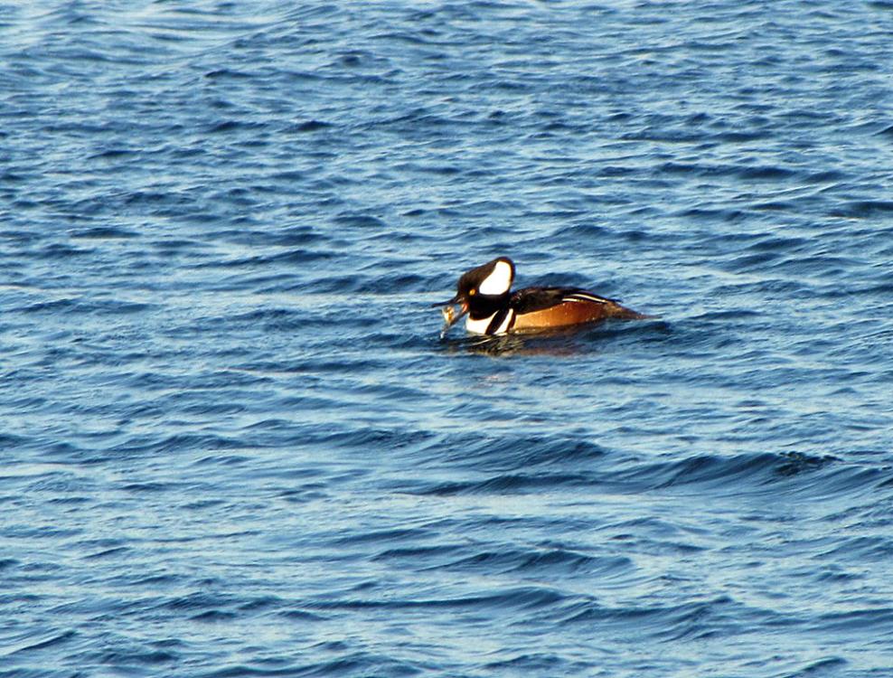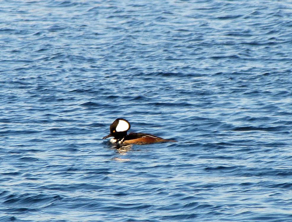 镜冠秋沙鸭,雄鳥頭上有若帶一頂黑白色的大帽子。