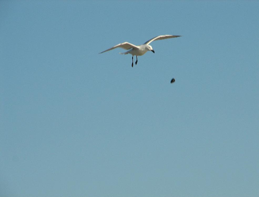 A seagull got a clam/mussel in its beak and flew up in the air about 30 to 40 feet above ground to prepare to