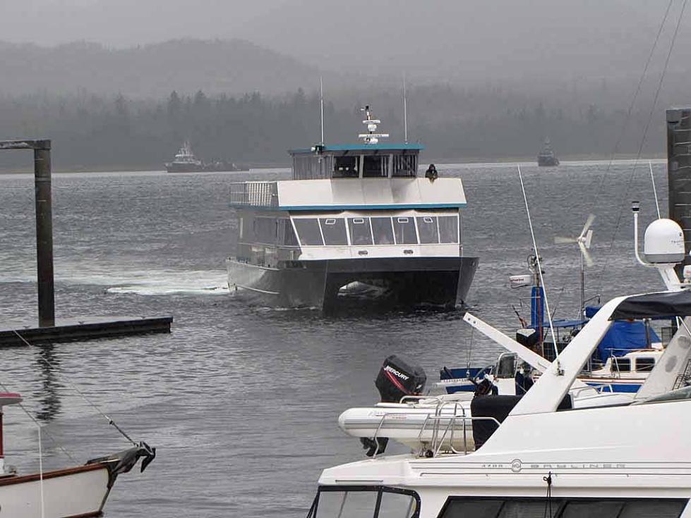 The catamaran tour boat running at high speed when it was out of the fjords and was going back to Ketchikan