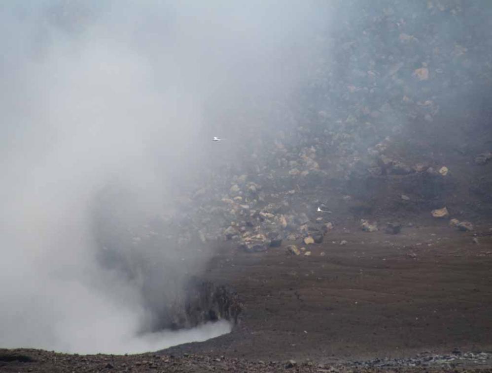 Two tropicbirds seem to be flying in the white smoke plume of the smoking Halemaumau Crater.