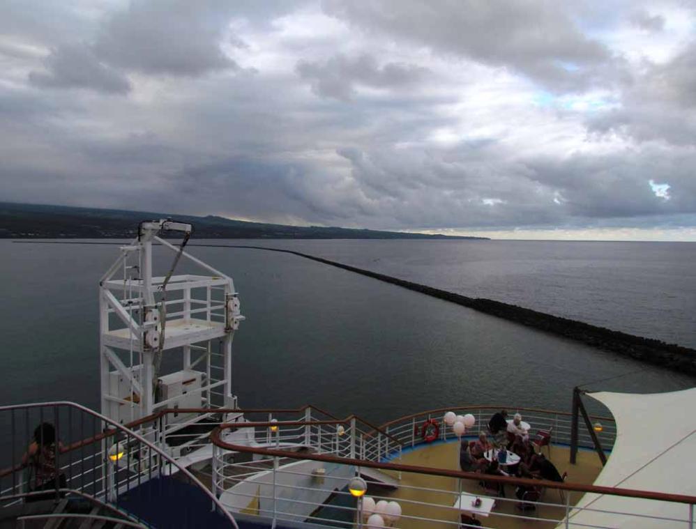 deck of our cruise ship as it was leaving sunny west coast of the Big Island of Hawaii to go to the Island of