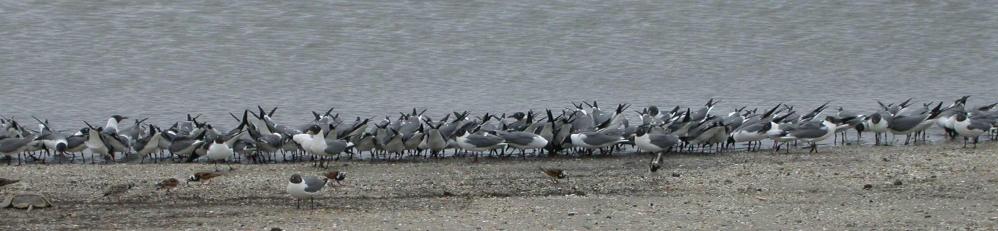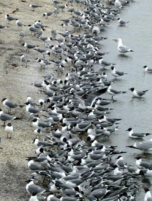 the waves so that some of the buried eggs become exposed. Then these laughing gulls and shorebirds feast