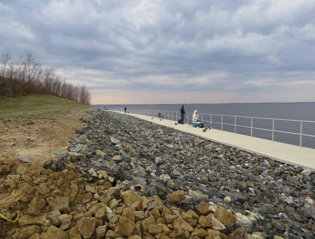 shoreline of Aberdeen/Cliffwood Beach on the Raritan Bay. Some people are fishing from this Seawall