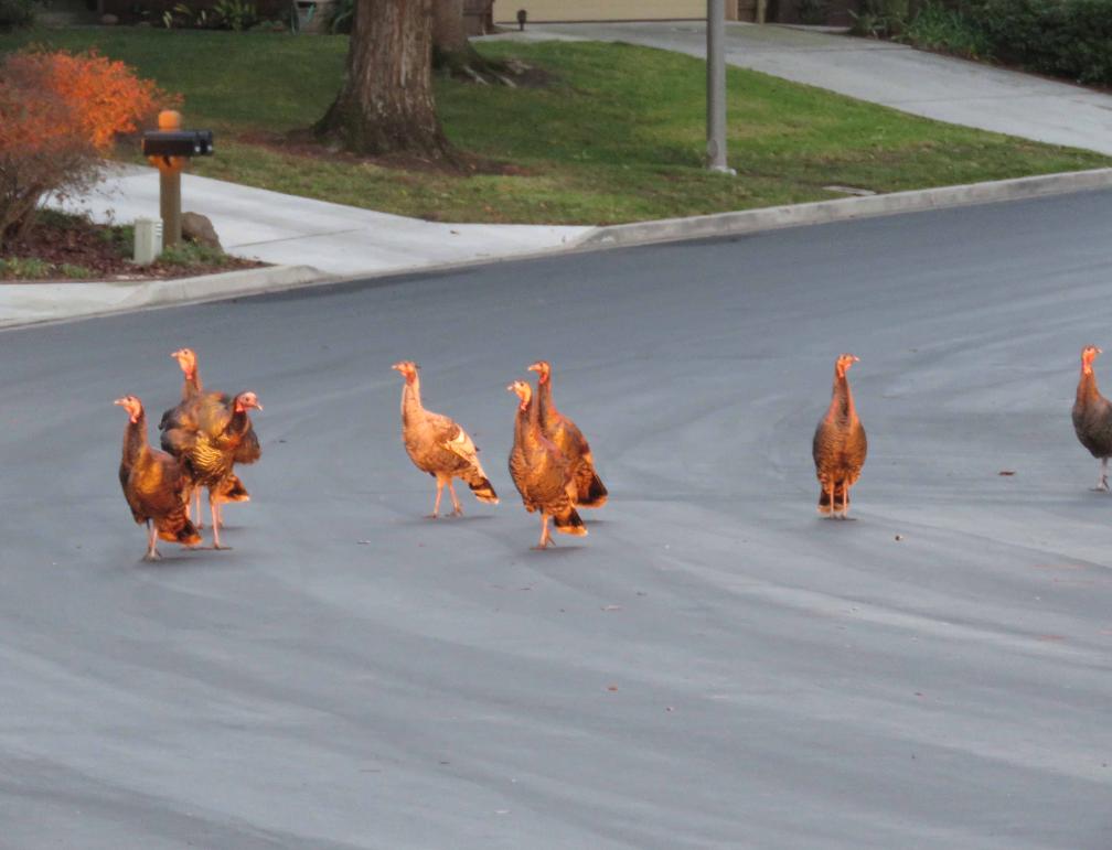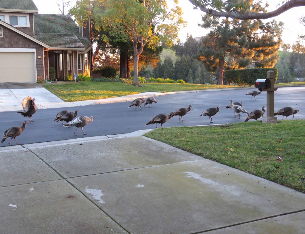 Many wild turkeys are roaming free in the hilly residential areas along the street on Antelope Hill in Fremont in