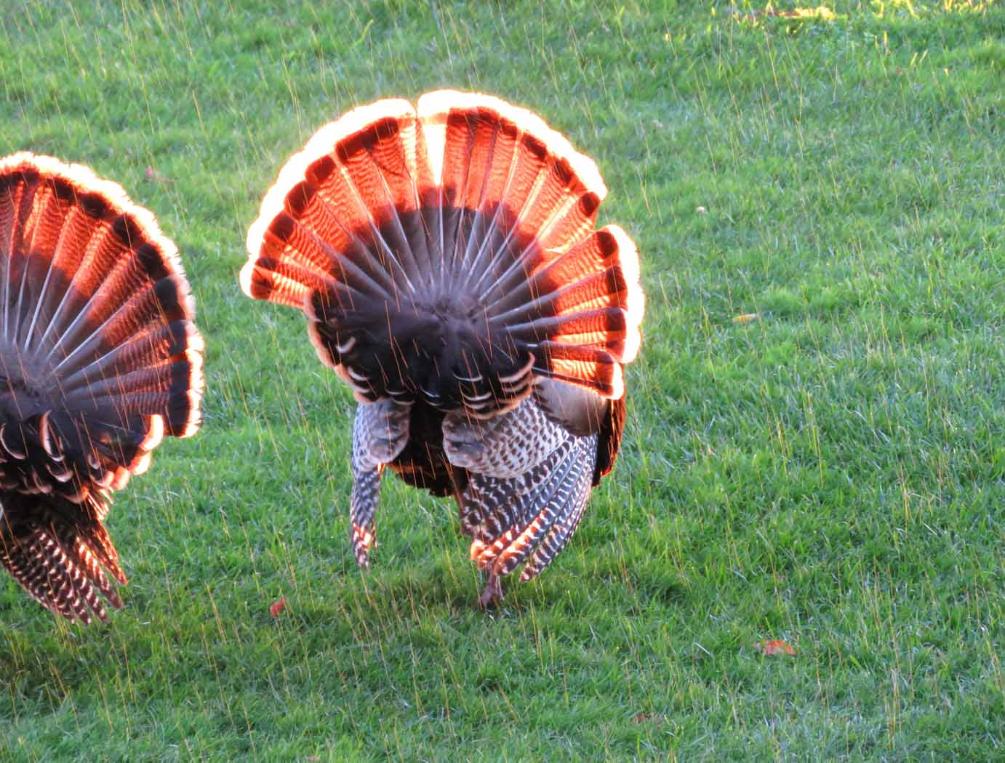 The golden sun ray at sunset time makes these wild turkeys look even more colorful and impressive.