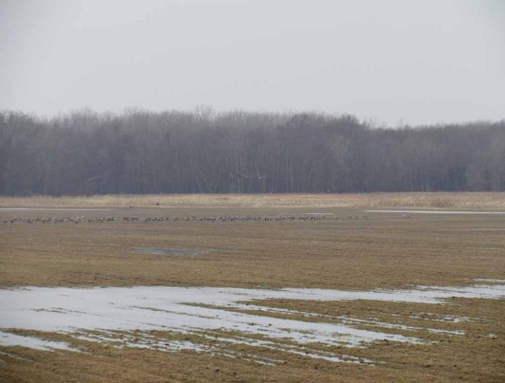 The "300-Acre-Goose-Pasture" in front of the elevated viewing platform. Notice that many sand hill cranes are