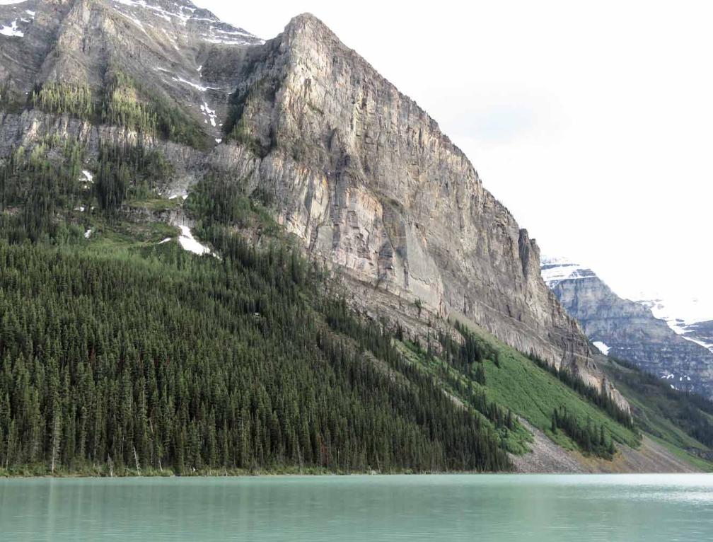 But when we look at Lake Louise almost horizontally from the lake shore, the color of Lake Louise is milky