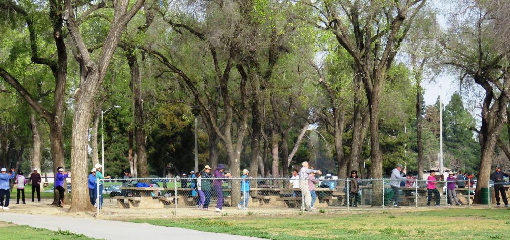Some senior people were doing slow paced gentle Tai-Ji type of exercise in the wooded area of the lakeside