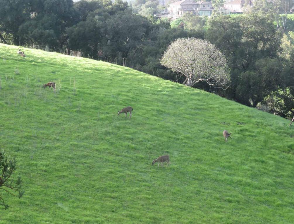Several deer often show up at hilly residential areas on Antelope Hill in Fremont, California.