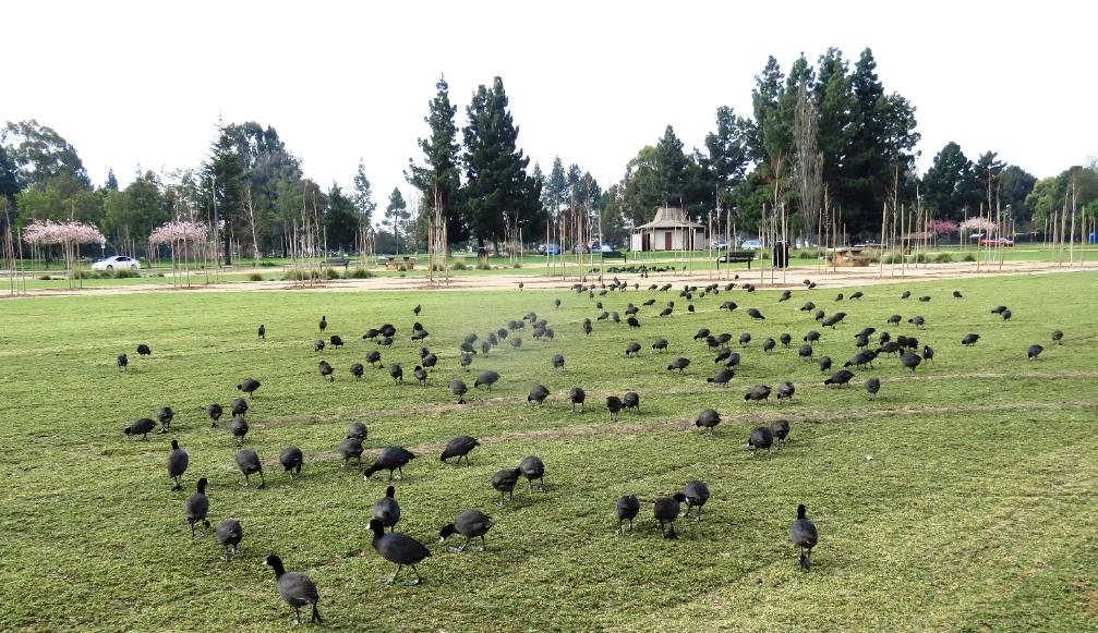 Many American Coots are getting up from the lake and are walking to the lawn.