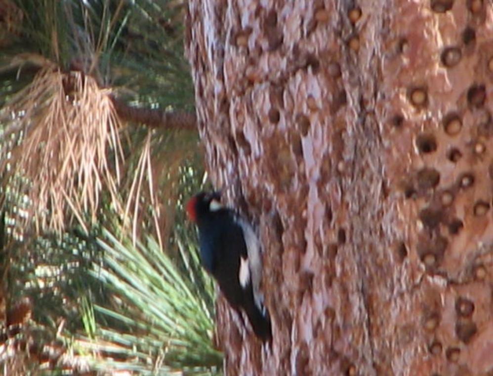 Another acorn woodpecker working on this tree. You see many holes with acorns inside on the tree bark