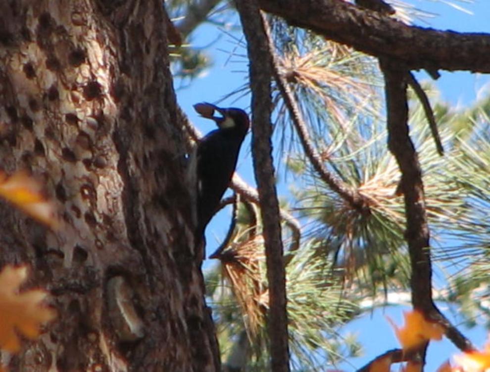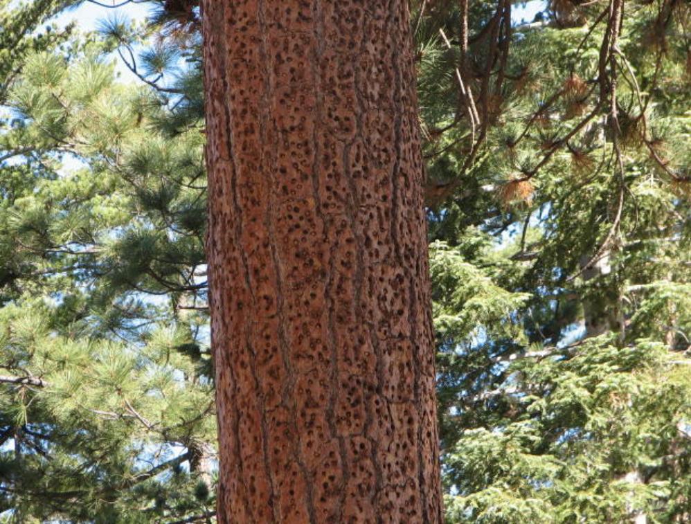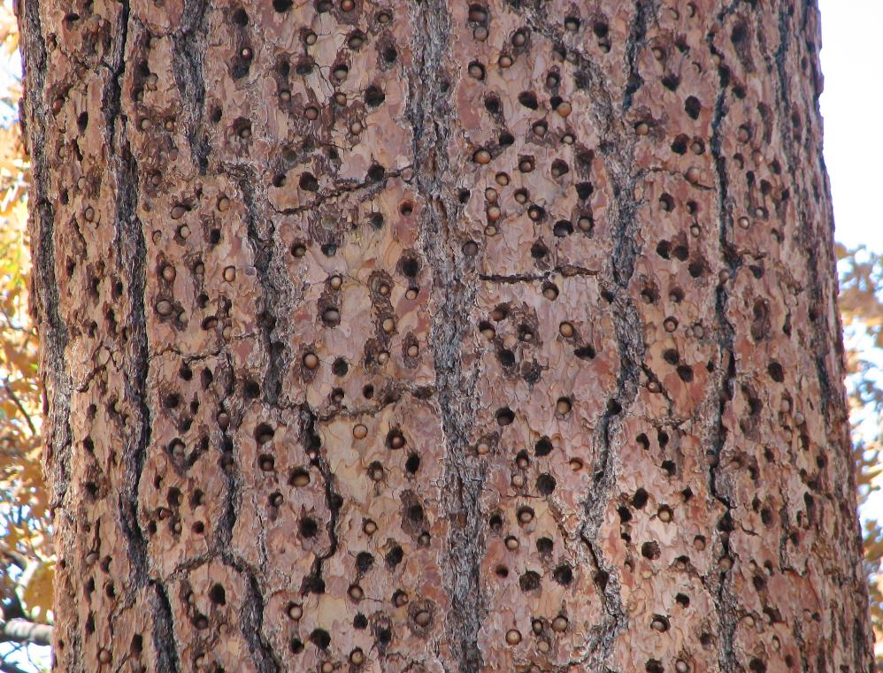 There are many deep holes with acorns inside these holes on the tree barks in this area near Jenks Lake.