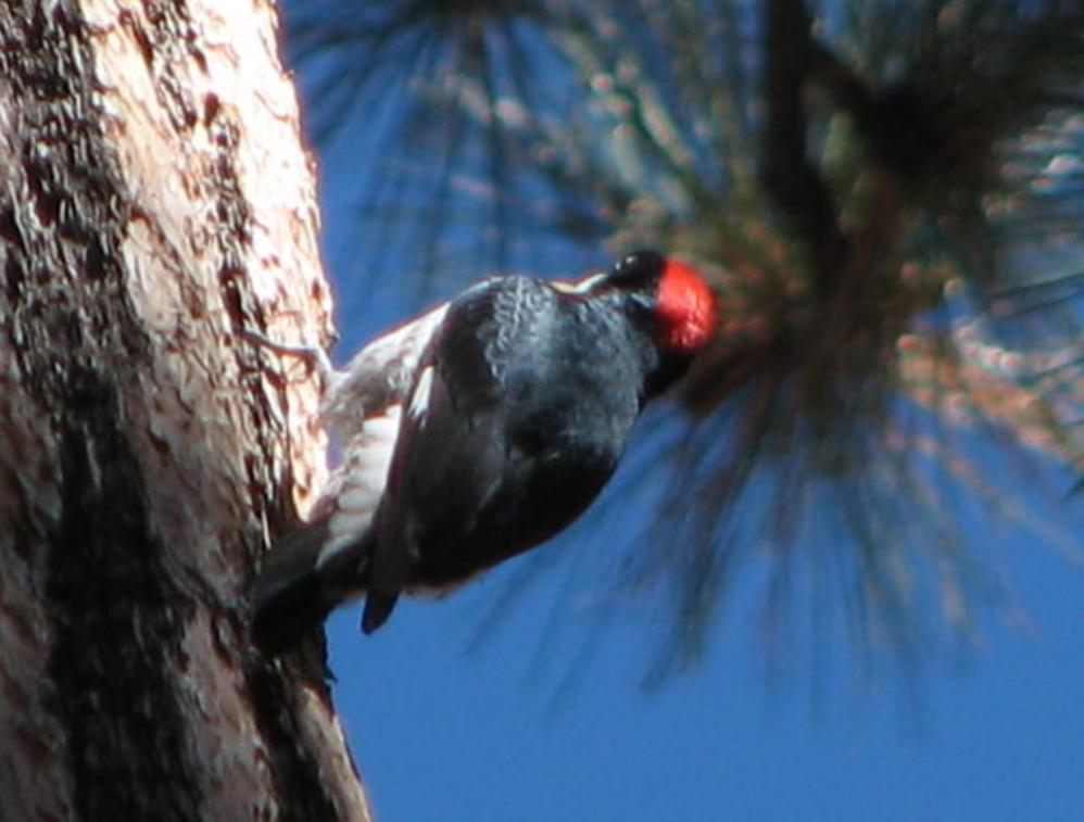 acorns. Acorn woodpeckers drill deep holes on these trees and pack acorns very tightly inside these deep