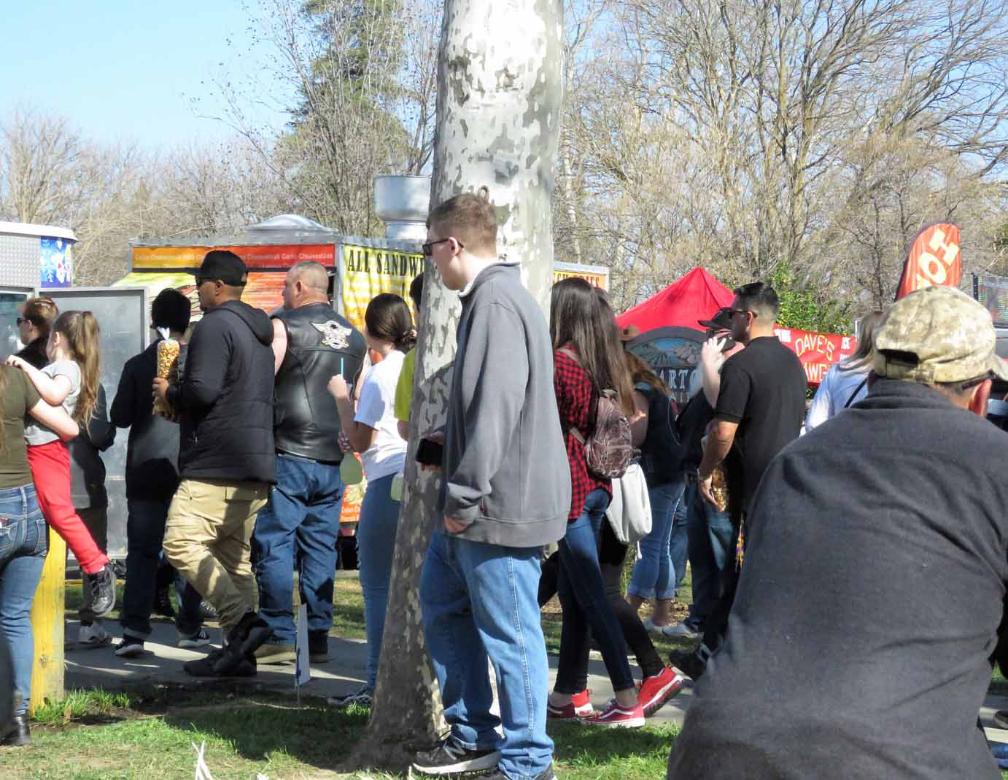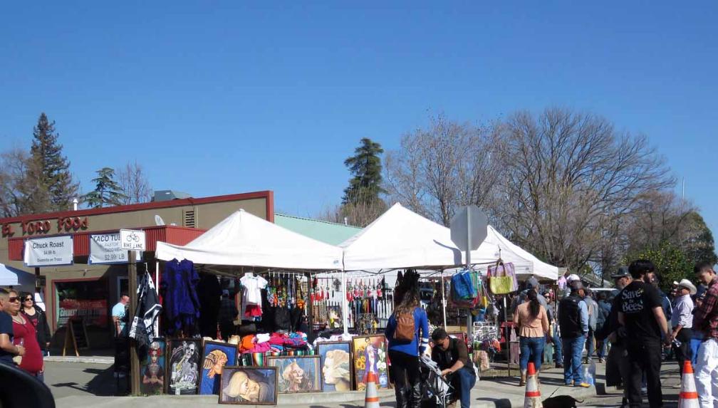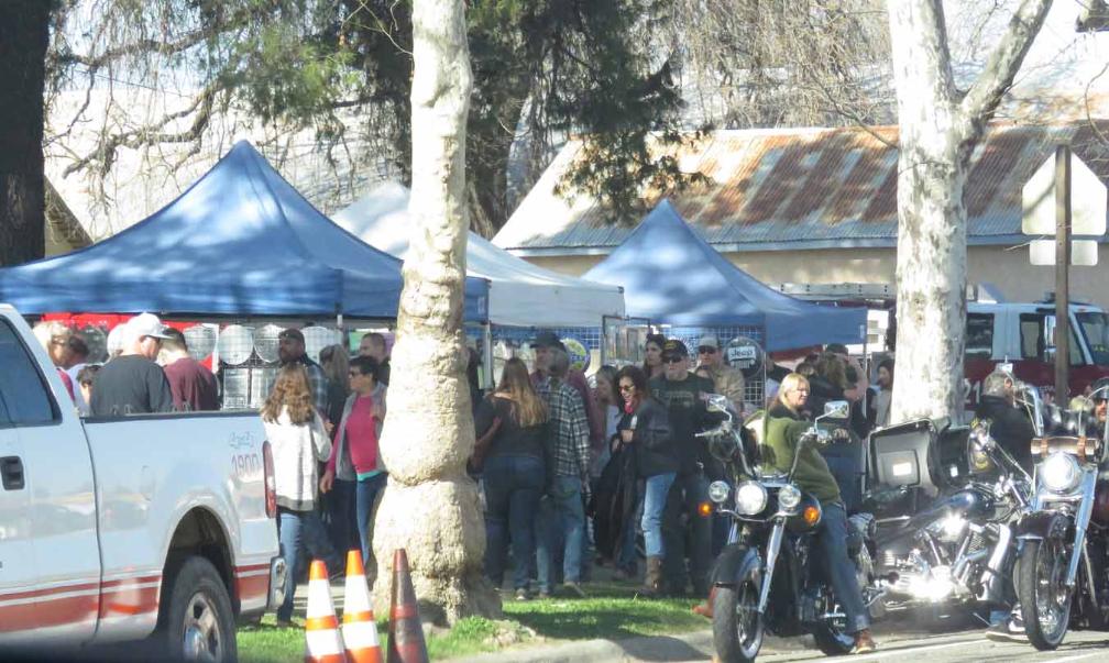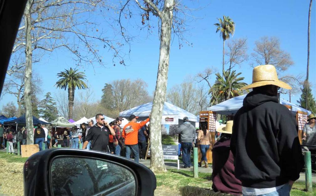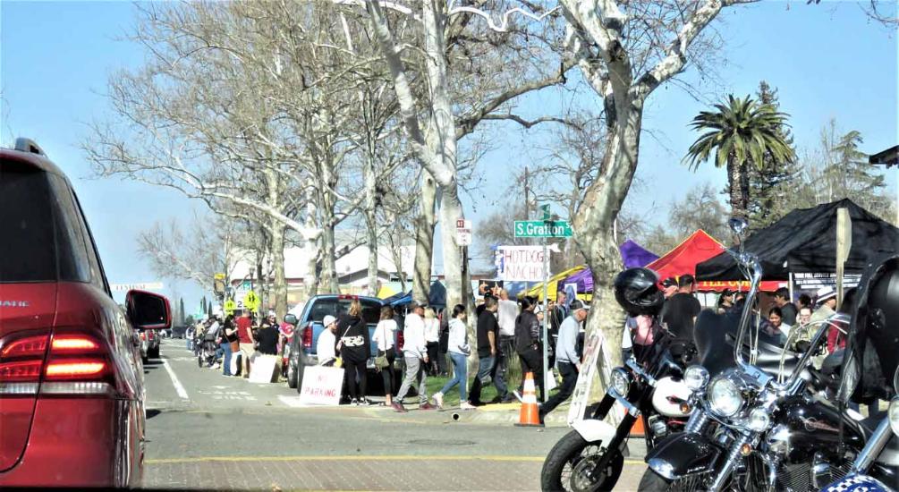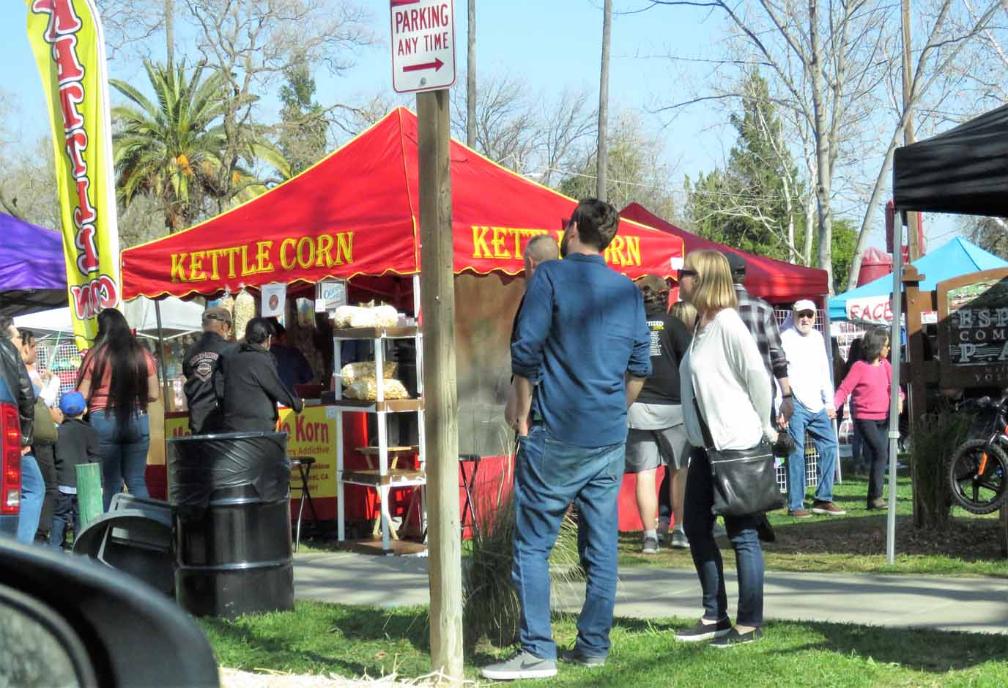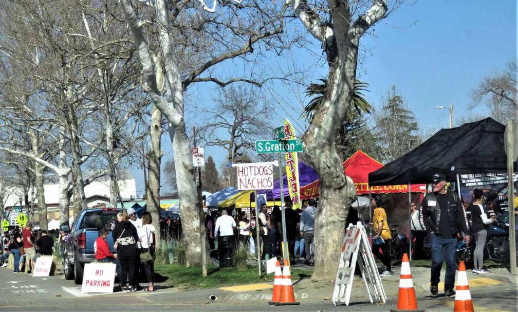 cars, motorcycles, and people enjoying the Almond Blossom Festival including food, arts and crafts, music,