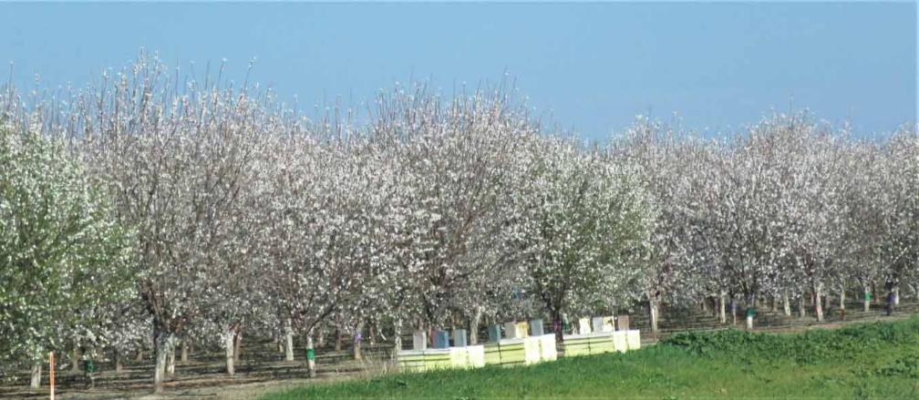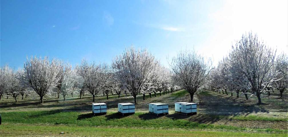 As the almond trees blossom, honey bees forage for pollen and nectar in the orchard. When the bees move