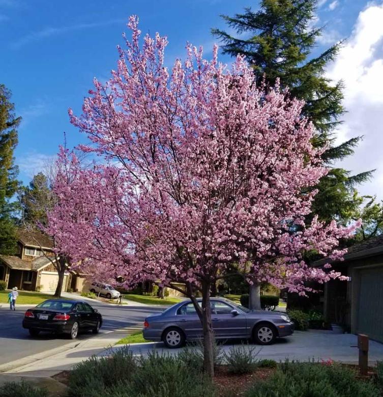 Zoom in for closer view of the blooming pink flowers on the street in Fremont, California.