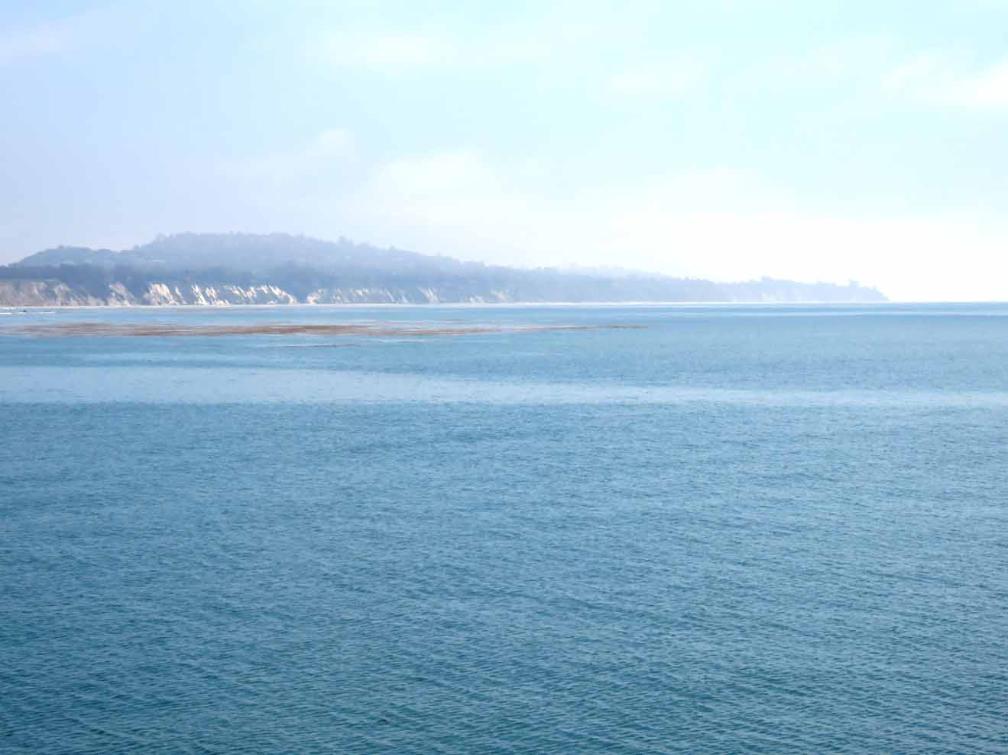 A mile-long lush kelp (sea weed) bed (or forest) runs parallel to the Goleta Pier on the right, or west side.