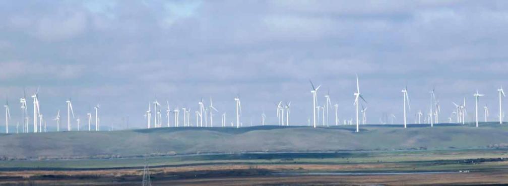 The wind turbine farm on Altamont Pass on south side of I-580 as viewed from Tracy.