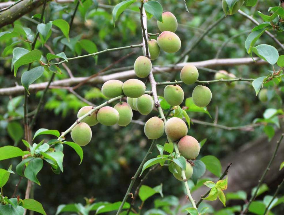 Fruits (梅果) of Prunus Mume (梅花) trees in Chinese Garden in April in Huntington Botanical Gardens. The