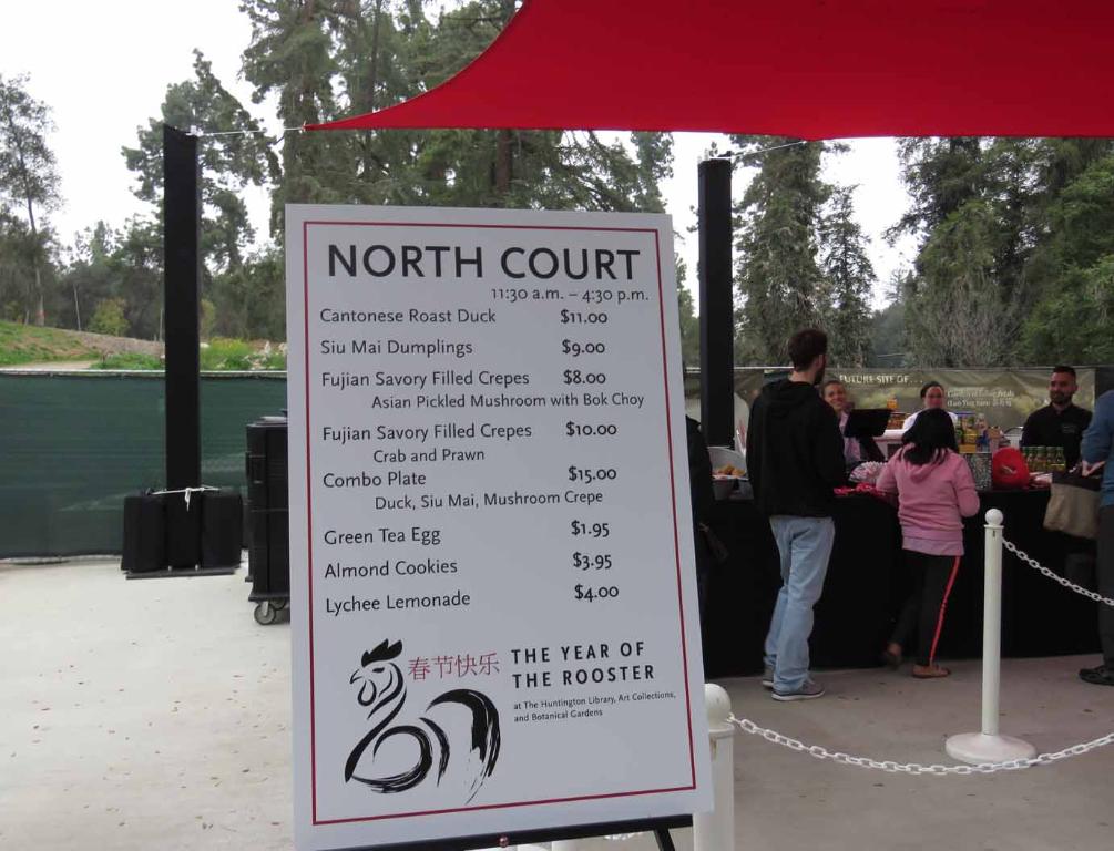 Menu of Chinese foods at North Court in Huntington Chinese Garden during the Chinese New Year Festival.