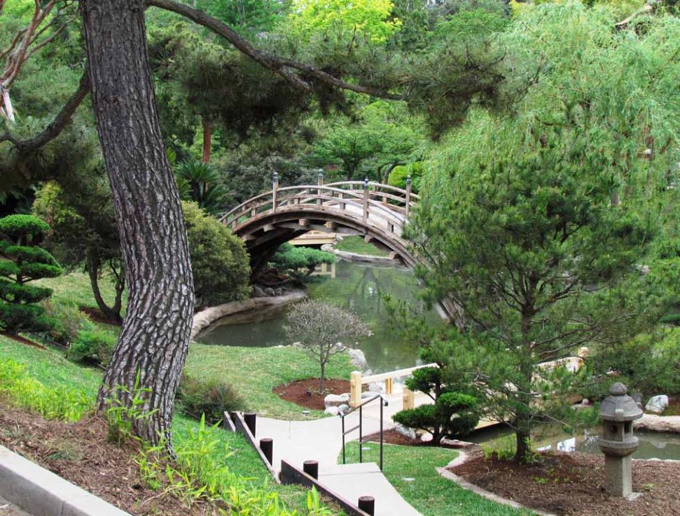 The distinctive moon bridge in the Japanese Garden in Huntington Botanical Gardens.