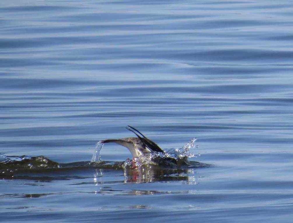 After diving from mid-air down into water to catch fish, a gannet re-emerged to the water surface on Raritan