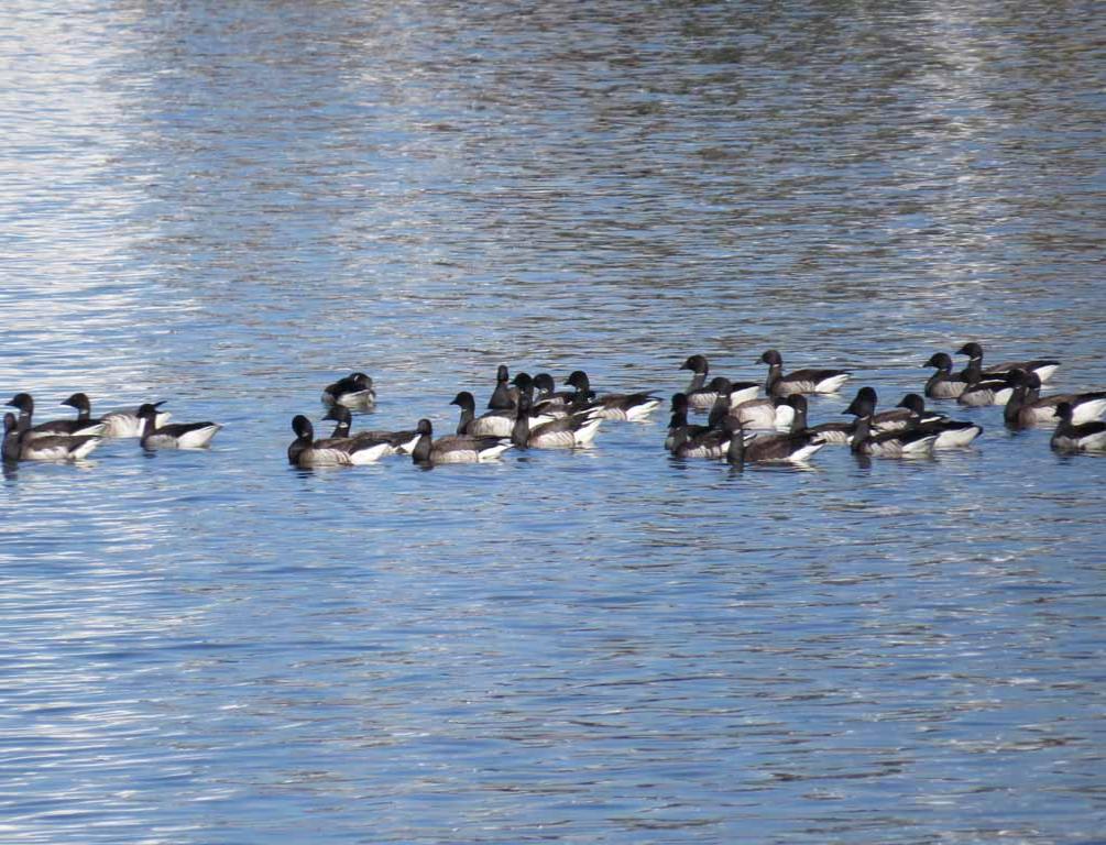 The group of many brants settled down on the water near the Promenade of Keyport Waterfront Park.