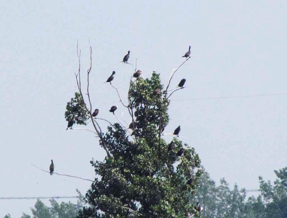 More than 10 cormorants perching on this tree on an island among the rapids of the St. Lawrence River.