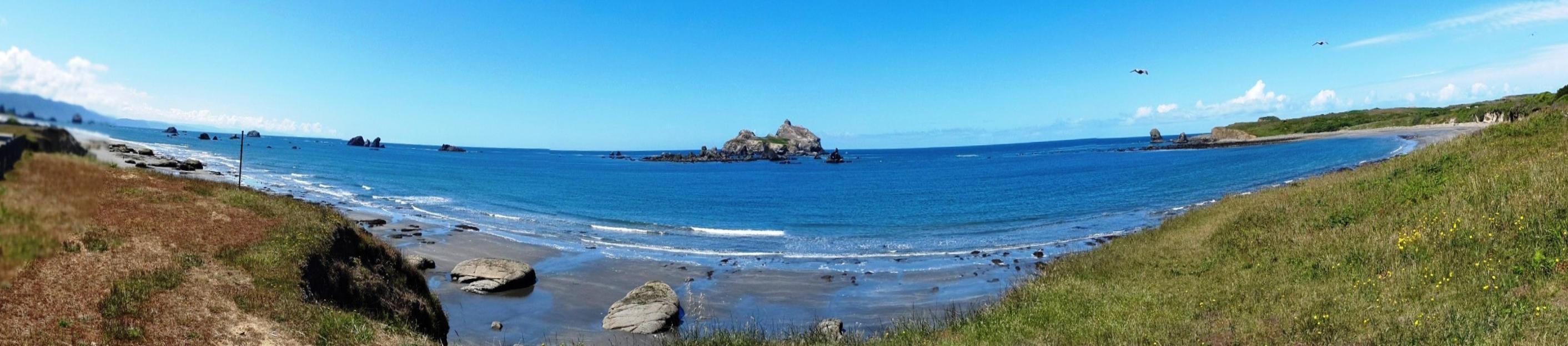 Panoramic view of rocky coast line with many rocks and stacks near Castle Rock National Wildlife Refuge near Crescent