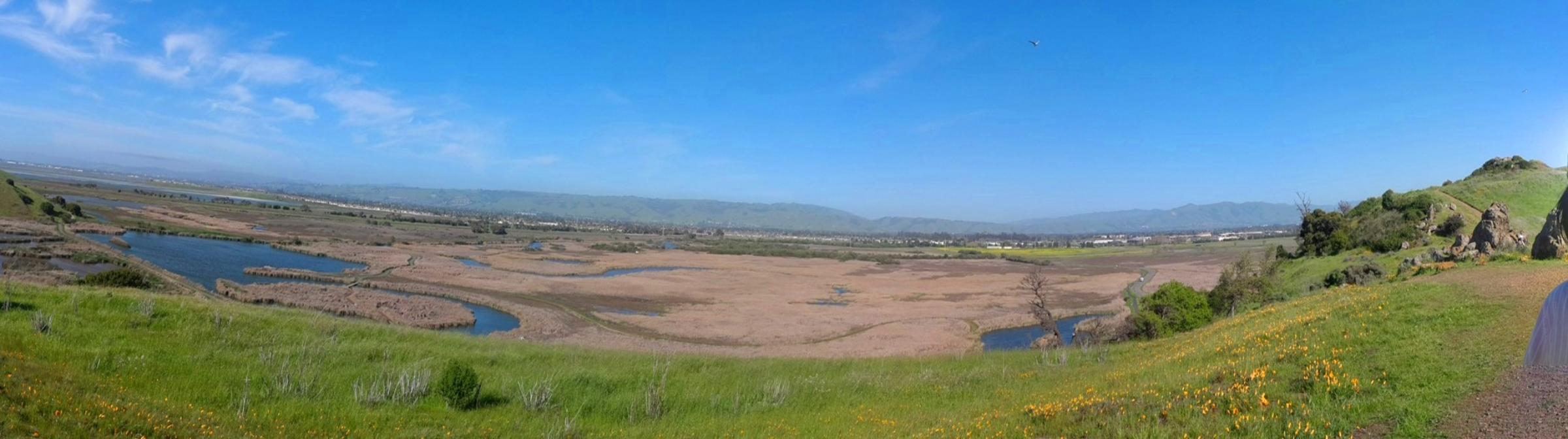 Panoramic view from one of the hilltops in Coyote Hills Regional Park along eastern shore of San Francisco Bay in Fremont,