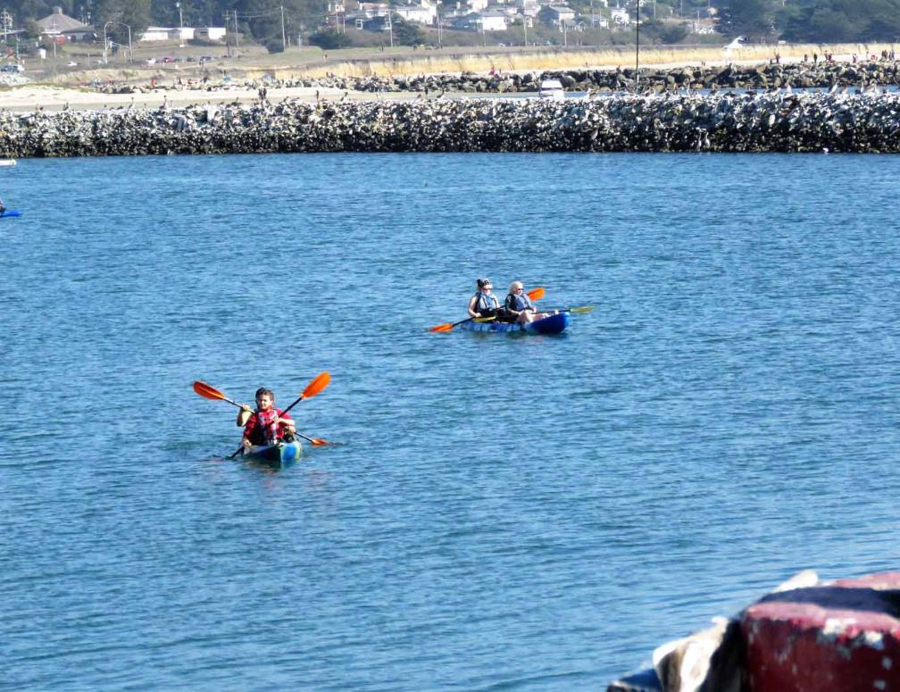 Many people are enjoying kayaking in Pillar Point Harbor surrounded by harbor jetty at the northern end of Half