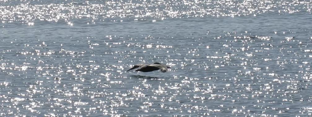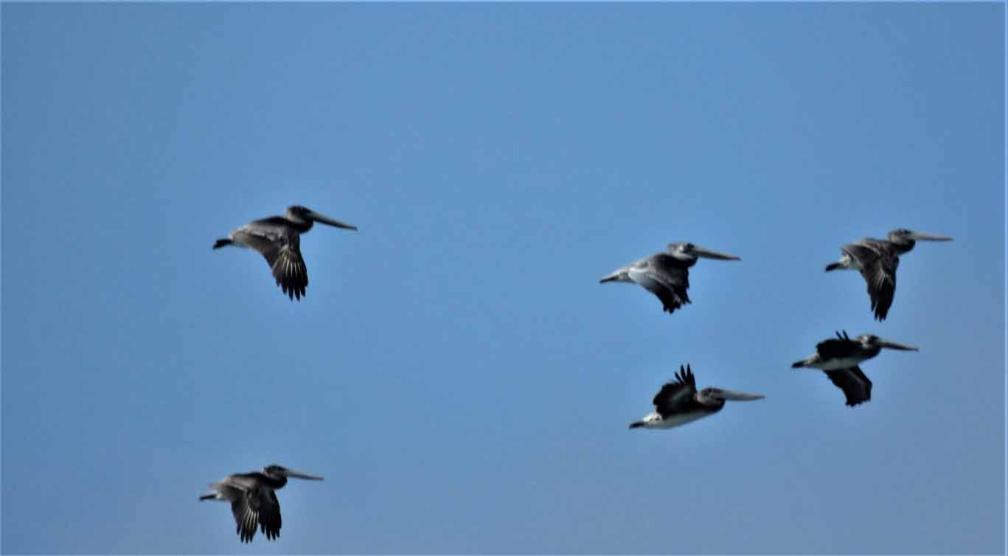 While driving on San Mateo Bridge, we saw a group of pelicans flying high above San Francisco Bay.