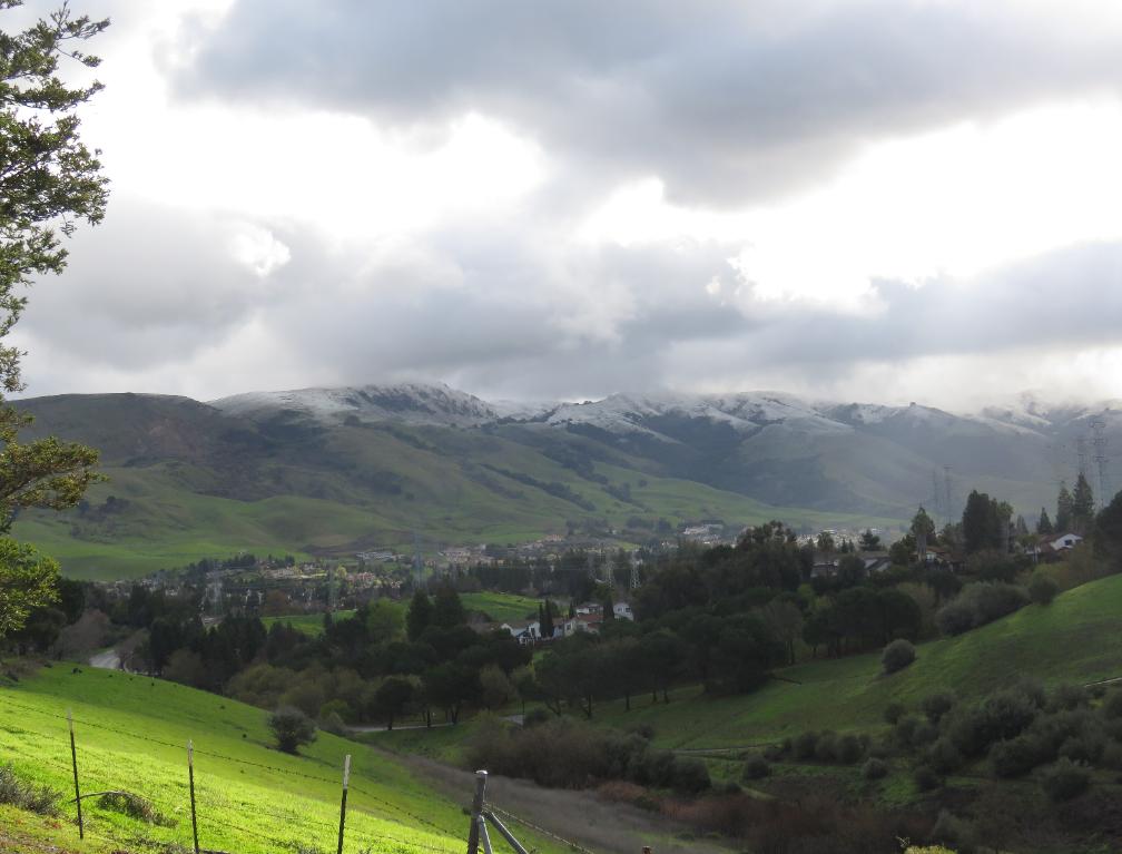 Snow covered peaks of Mission Peak/hills in Fremont in San Francisco Bay Area on Tuesday morning, Feb 5,