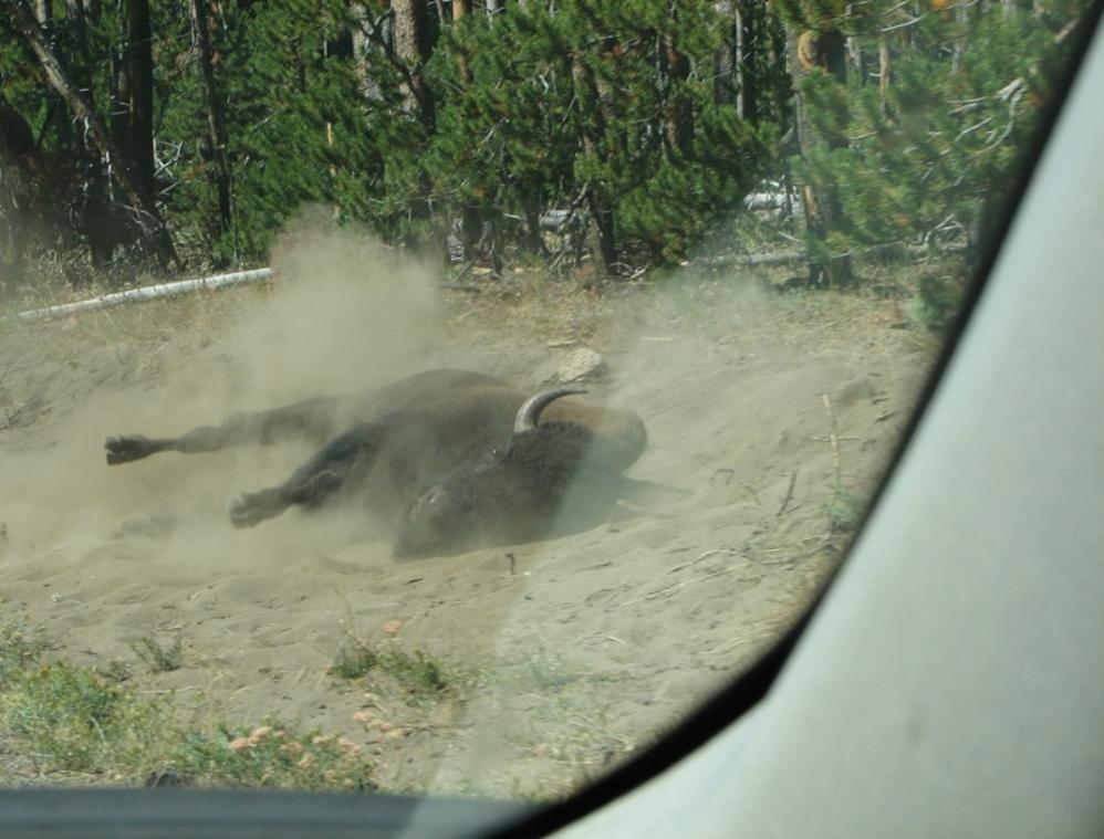 One of the bisons was rolling and wallowing in the sand and dust on the roadside probably to escape the