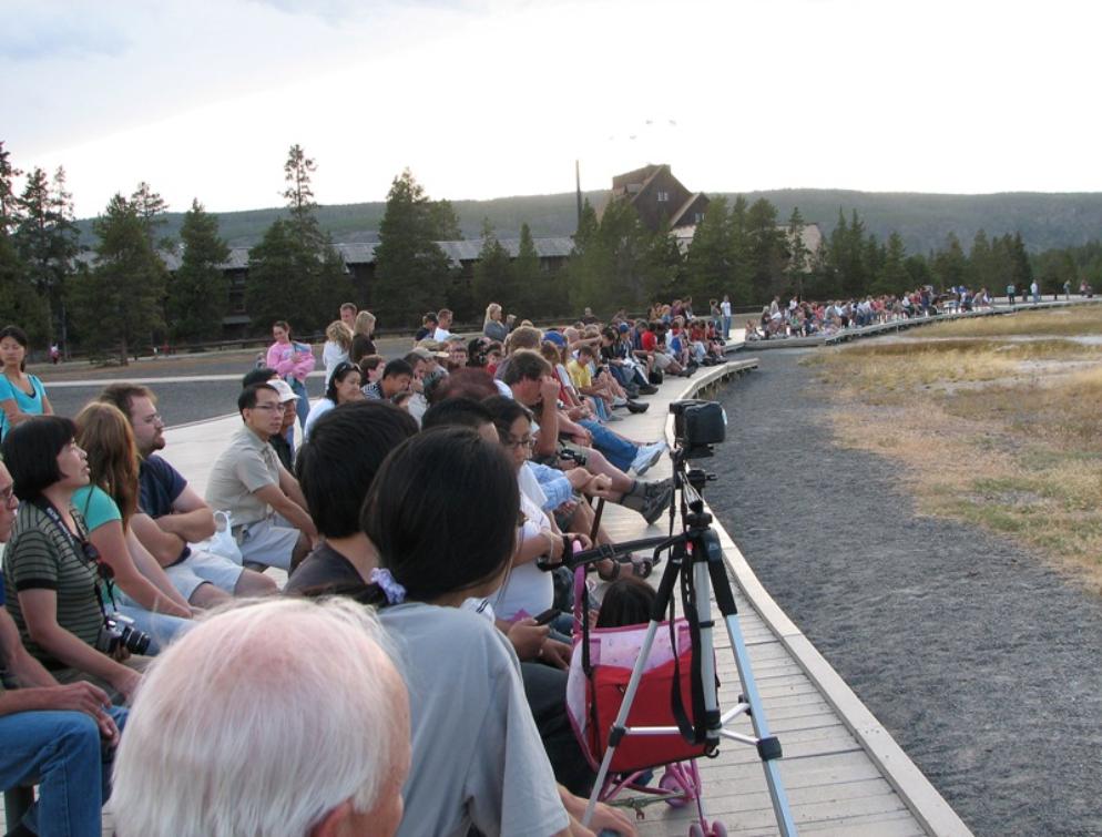 Many tourists sitting on the benches along a large half circle to wait to see the big eruption of the Old Faithful